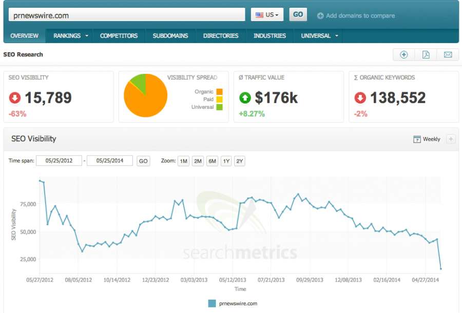 Using SearchMetrics, I looked at the top Press Release sites and checked if they lost any SEO visibility on a large scale since Panda 4.0 hit, and PRWeb.com, PR Newswire, BusinessWire and PRLog all seem to have lost significant rankings in Google.